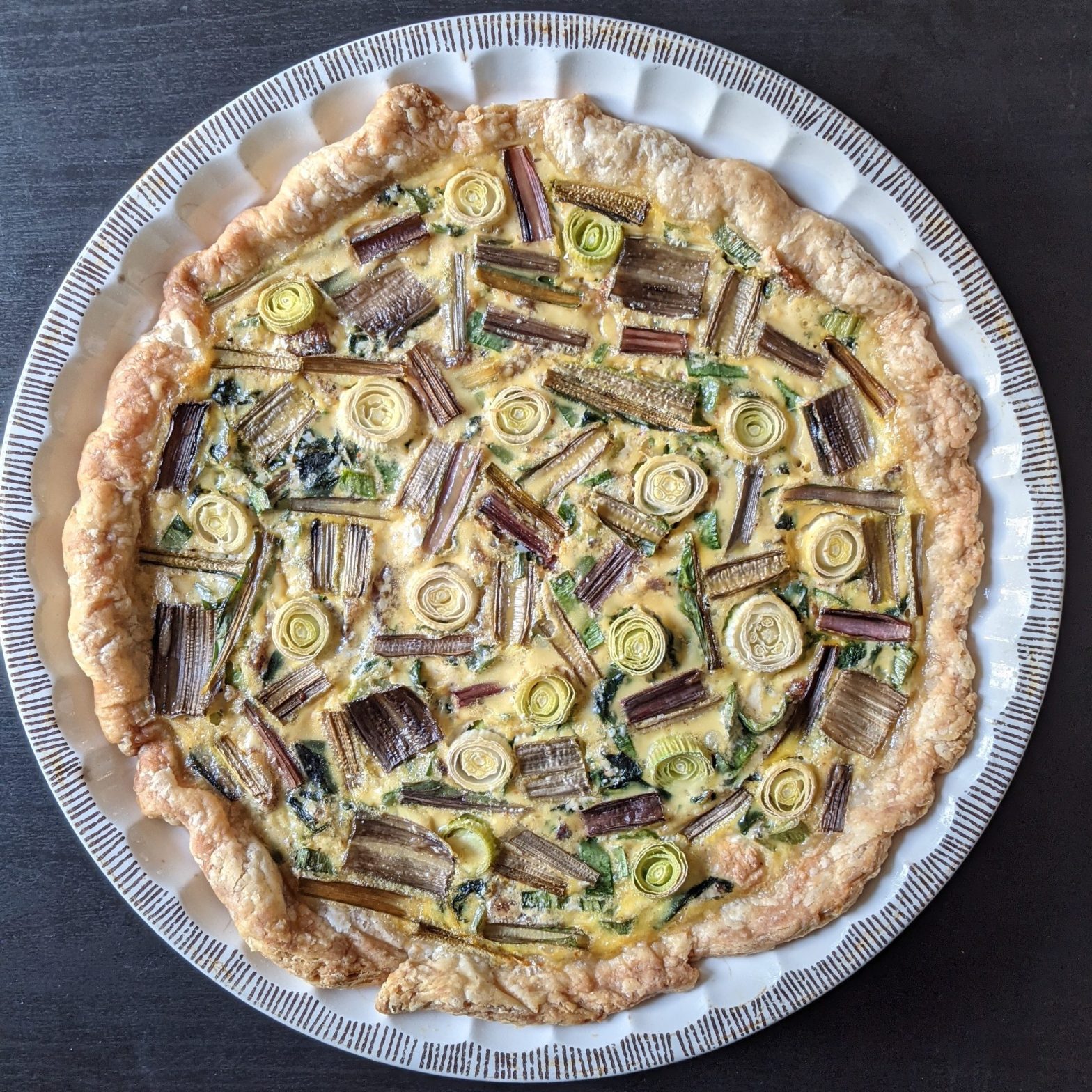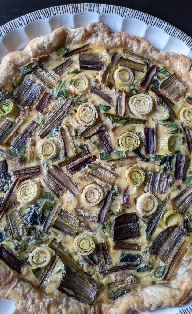For this recipe, I will first give you the specific ingredient list for making a green garlic, swiss chard, smoked mozzarella quiche before then giving you the more vague list that you can then take and customize to suit your fancy. Get creative and experiment! I started out with a family recipe my mom gifted me when I first started cooking years ago, and I’ve been experimenting and expounding upon it ever since. For example, the original recipe doesn’t have any onion in it. How is that even legal? Any way, I hope you find these instructions useful!
